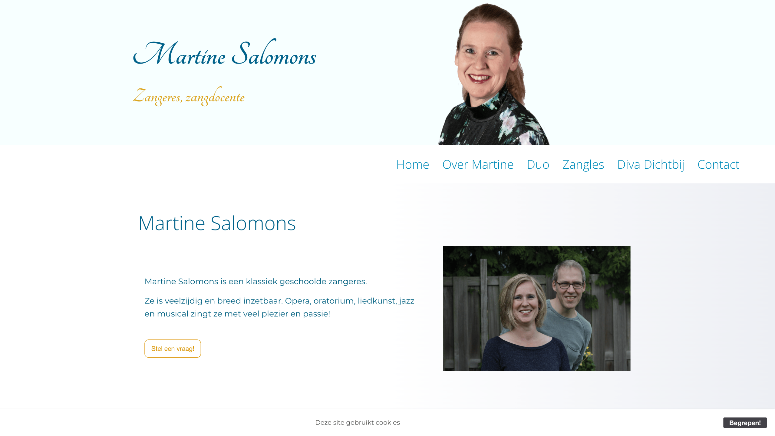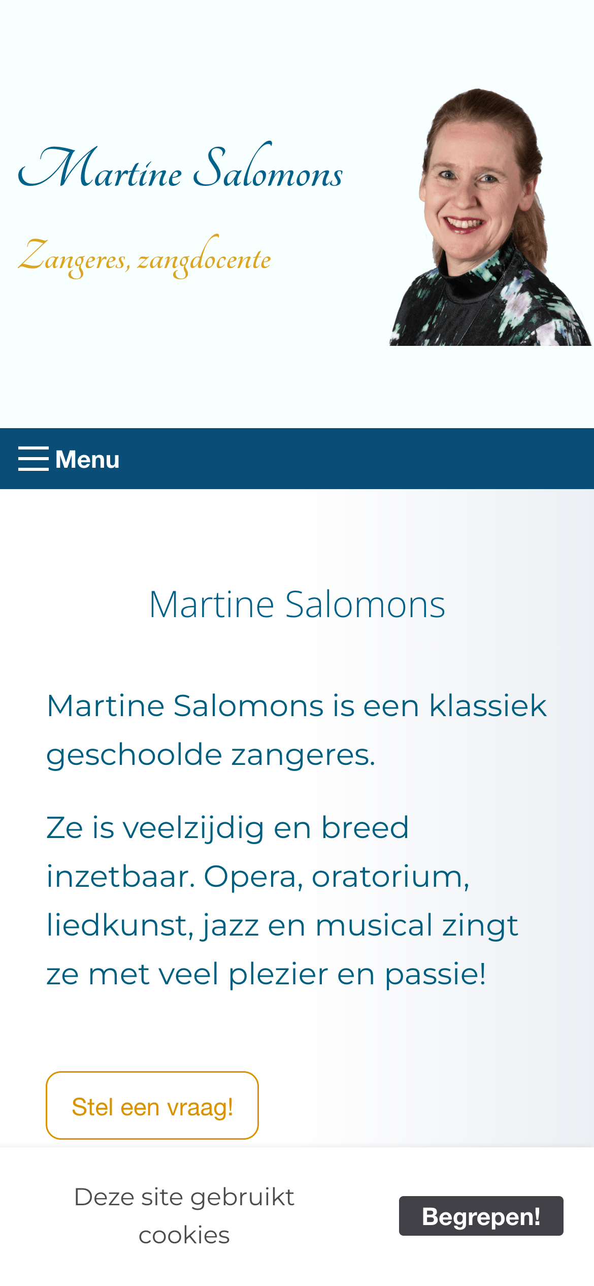 De website van zangeres en muziekdocente Martine Salomons is een stijlvol voorbeeld van een eenvoudig maar effectief online portfolio. Alle essentiële onderdelen zijn aanwezig om het vakmanschap van haar eenmanszaak professioneel te presenteren.